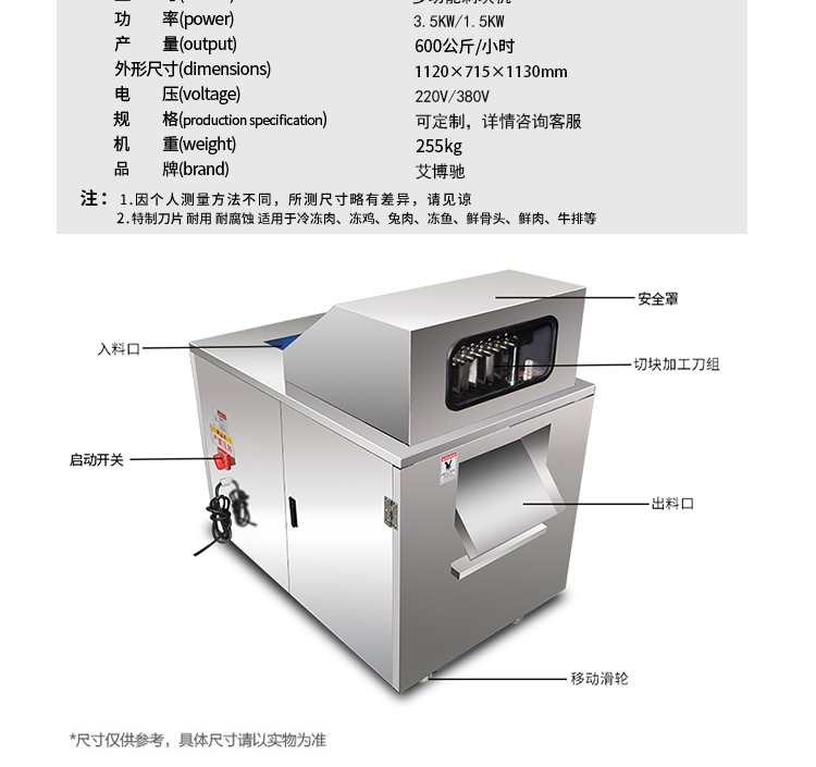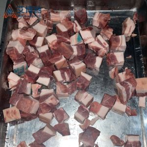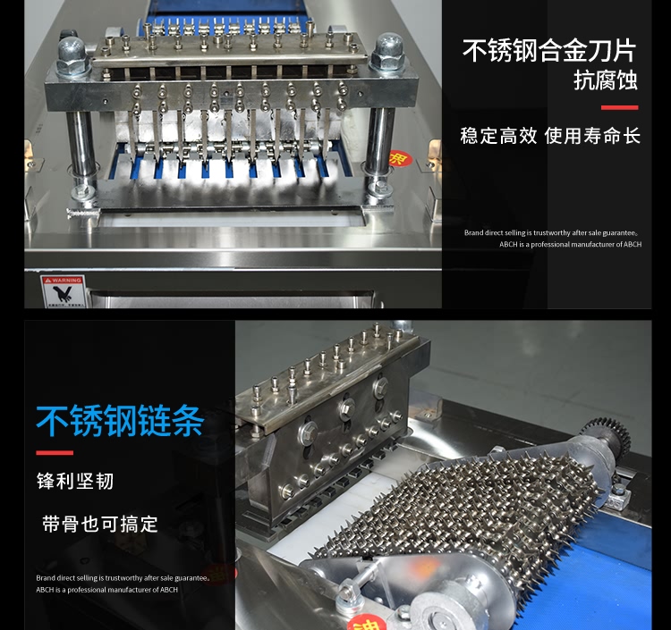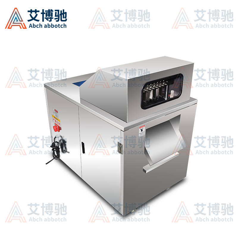 艾博馳ABCH-13A禽肉類剁塊機(jī)適合禽類,魚類的剁塊,剁段需求,輸送裝置采用單片食品級PE材質(zhì)膠板設(shè)計(jì),可單片更換,非常方便,壓料輸送裝置采用針式鏈條設(shè)計(jì),有效防止物料打滑后退或輸送不均勻等弊端。丁刀組丁刀刀距寬度可定制規(guī)格(2cm、2.5cm、3cm、3.5cm)等,標(biāo)配3CM,最小2cm,實(shí)際成品小于丁刀刀距0.2cm,長短1cm-5cm可調(diào),物料需冷凍,效果更佳!