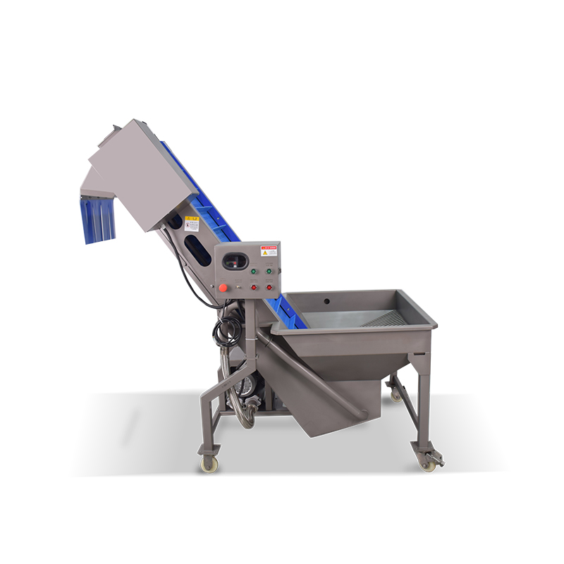 提升輸送裝置上料端置于清洗槽內(nèi),實(shí)現(xiàn)清洗與提升一體,且清洗槽內(nèi)設(shè)有條型篦子,便于物料與水及雜質(zhì)的分離