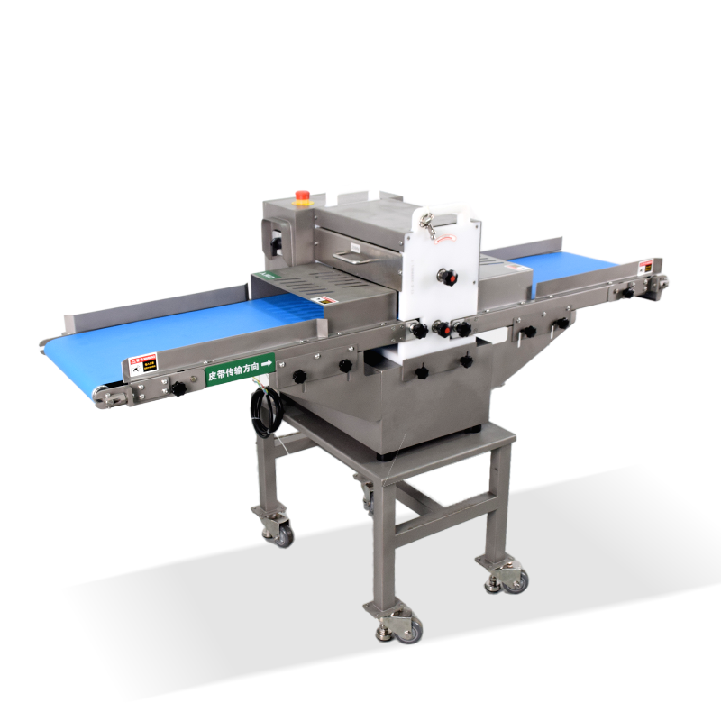 利用鋒利刀片將鮮肉第一次開(kāi)條、第二次切塊,對(duì)于切割紅燒肉塊形狀效果非常好