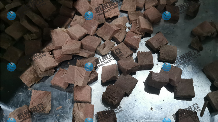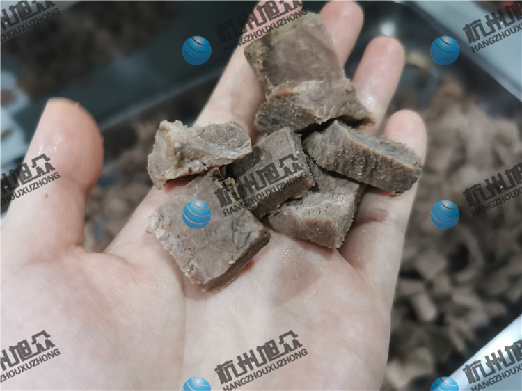 客戶自帶熟牛肉來(lái)現(xiàn)場(chǎng)試機(jī)——切丁機(jī)