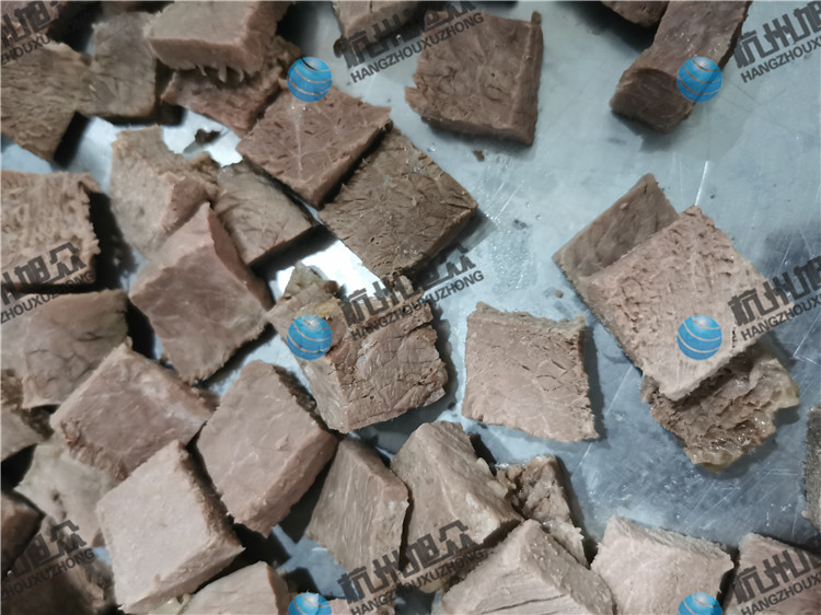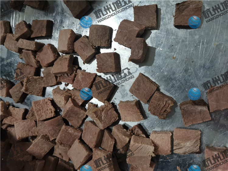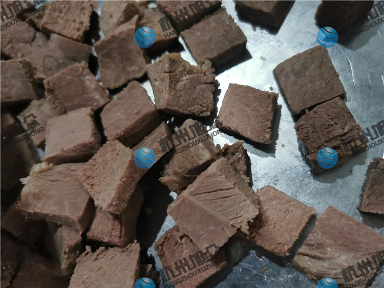 今日客戶自帶熟牛肉親自來(lái)廠試機(jī)看效果,用切丁機(jī)切熟牛肉丁,看看效果如何吧!